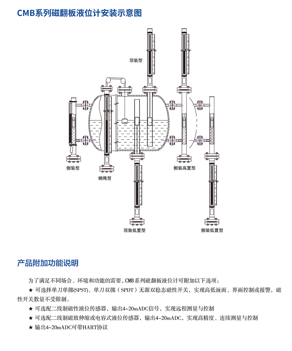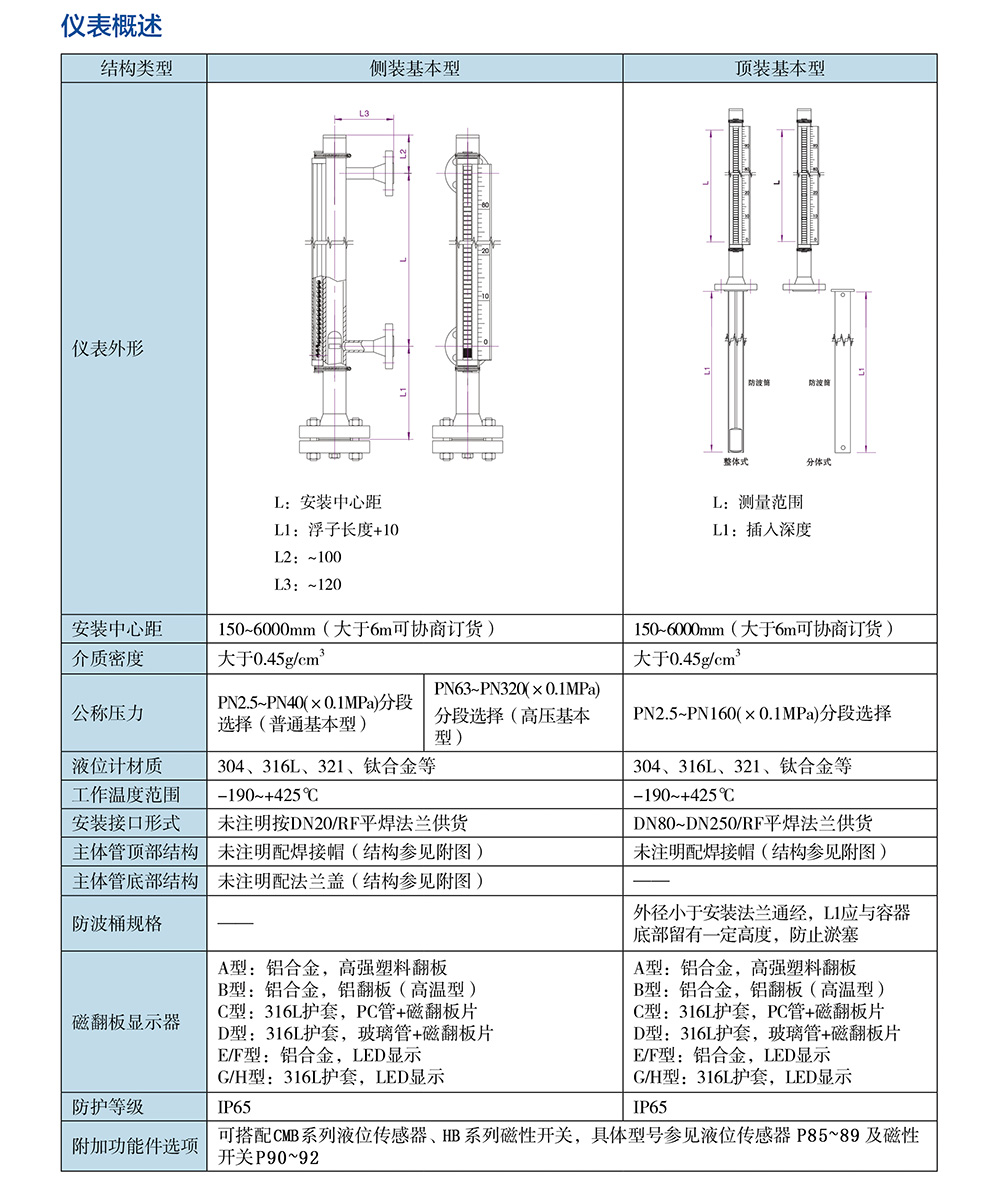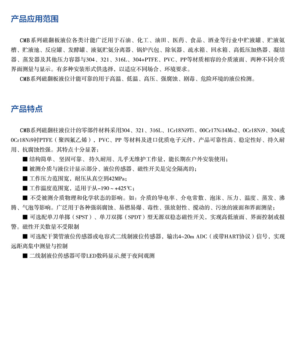 磁翻板液位計是一種新穎的類似于直讀式液位計的檢測儀表,它利用磁吸引原理,使測量指示機構與被測介質完全隔離,為各種介質液位的檢測提供了安全可靠的手段和方法。磁翻板液位計的工作原理:通過測量元件磁性浮子將液位的變化經磁耦合驅動指示標尺上的雙色(紅與白)指示柱翻轉,使液面以下指示紅色,液面以上指示白色,很醒目、清晰地顯示出容器中的液位。根據觀察方向的需要,翻柱面板朝向可隨意調節。
