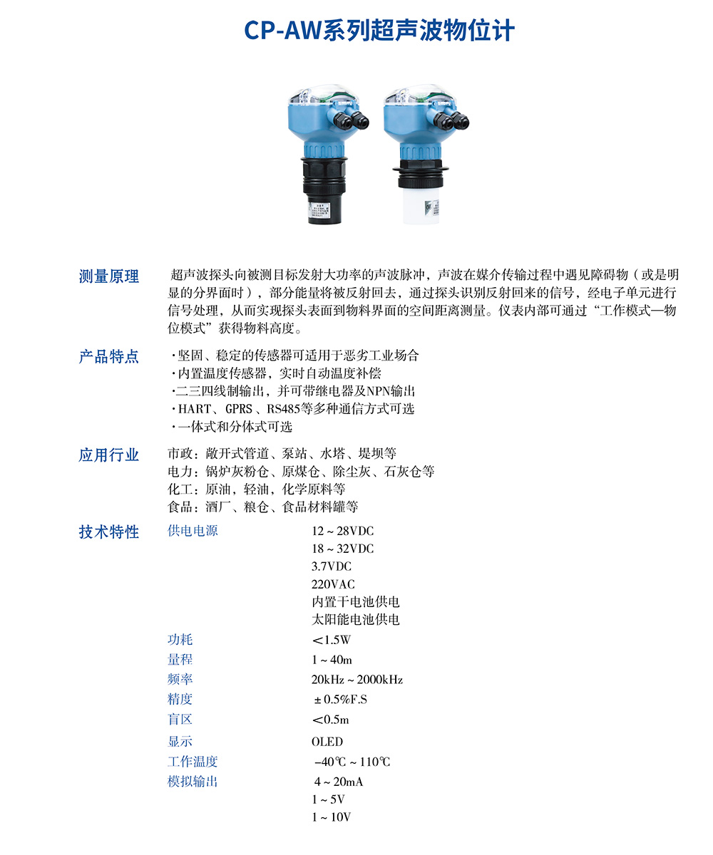 超聲波液位計是由微處理器控制的數字物位儀表。在測量中脈沖超聲波由傳感器(換能器)發出,聲波經物體表面反射后被同一傳感器接收,轉換成電信號。并由聲波的發射和接收之間的時間來計算傳感器到被測物體的距離。由于采用非接觸的測量,被測介質幾乎不受限制,可廣泛用于各種液體和固體物料高度的測量。
